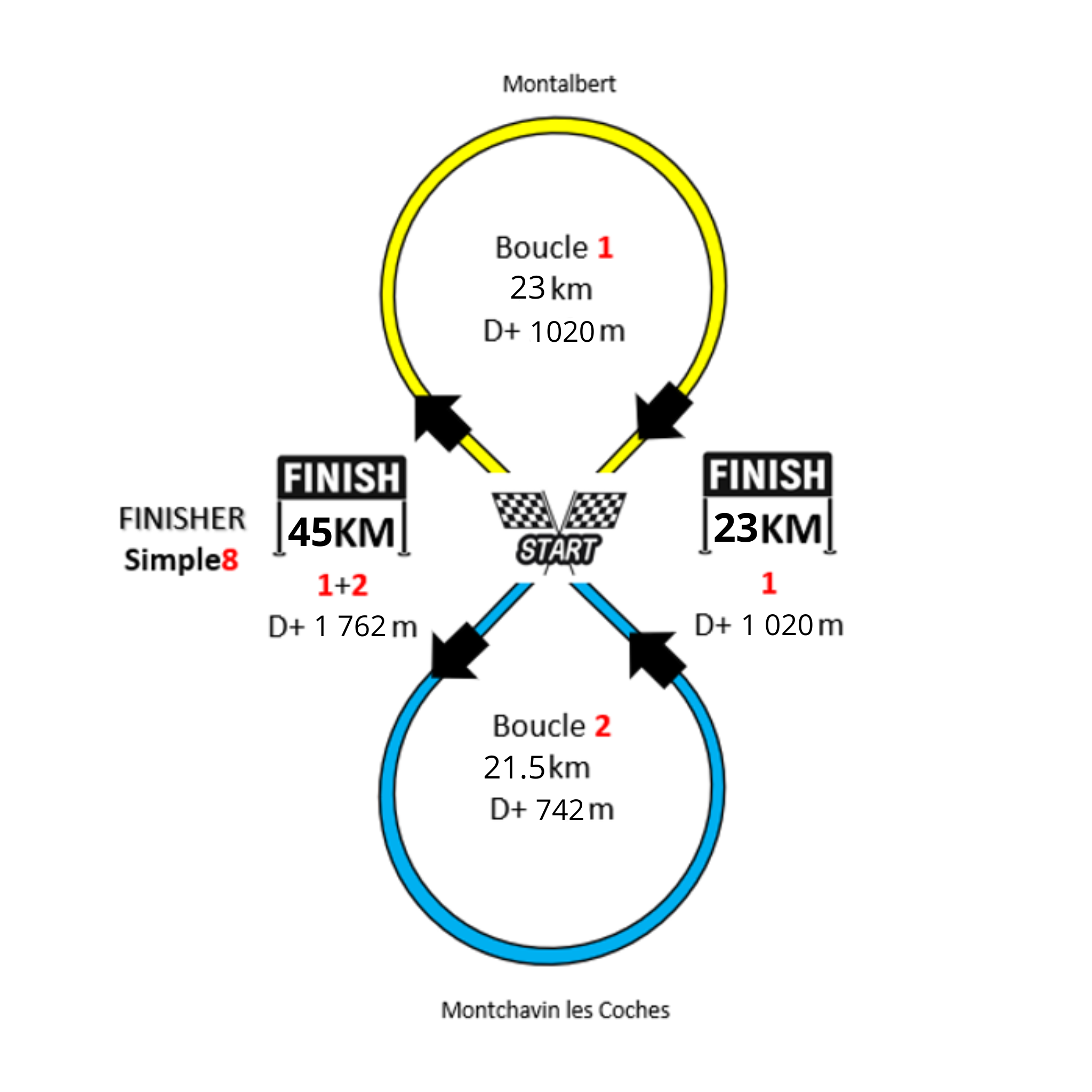 The time limits for the Simple8correspond only to the starting times for loops 2, 3 and 4. When a competitor finishes a loop, he/she must take into account the time needed to change batteries and to take a break at the refreshment station before starting the next loop. If the time limit is exceeded, the competitor will be refused access to the start of the loop concerned and will have to hand in his timing chip to the organizer, who will register his end of race.